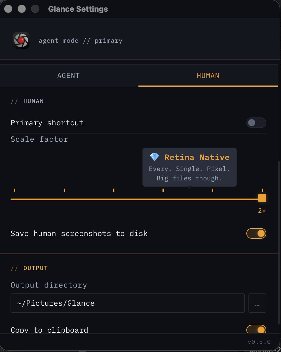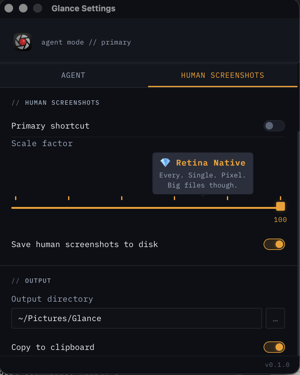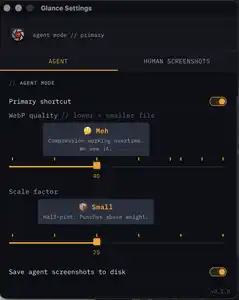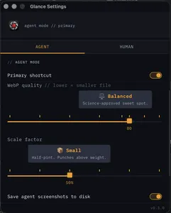 AI vision models don't see file sizes — they see pixels. The formula is simple: tokens = (width × height) / 750. A human-mode 956×1196 screenshot costs ~1,524 tokens. Glance scales it to 239×300 — just ~96 tokens. That's 16× cheaper.